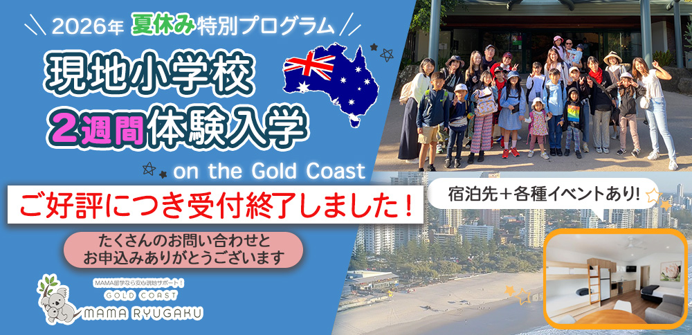 【Mama留学主催】オーストラリア小学校2週間体験入学 20… 続きを読む: 【受付終了!】2026年夏休み特別プログラム|オーストラリア小学校2週間体験入学 - <2026年1月2月3月>ゴールドコースト/ブリスベンの語学学校キャンプ受付スタート